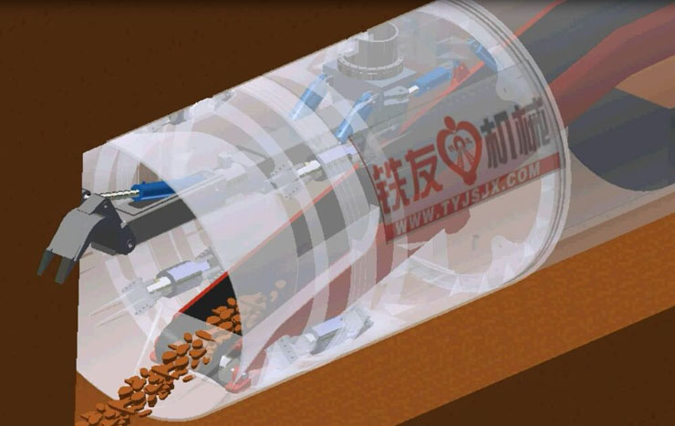 挖掘式頂管機是一種非開挖(wā)施工工藝,當頂管機前端的斜(xié)麵(上凸下縮,有效控製和預防泥土塌落)進入土層中,頂管內部的挖掘鬥通過液壓機械臂(挖鬥油缸和變幅油缸的行(háng)程)的變化,將頂管(guǎn)機上部泥土挖(wā)掘(jué)下來,挖掘下的泥土匯集在機頭下部皮帶輸(shū)送機位置,啟動皮帶輸送機,輸送帶將泥土(tǔ)輸送(sòng)到電(diàn)動小車(可調速)上,小車將泥土從(cóng)工作井送出(chū)指定地點,在機頭後(hòu)頂入水泥管(guǎn),這樣在工作井和接受井間鋪設一條水泥管道。